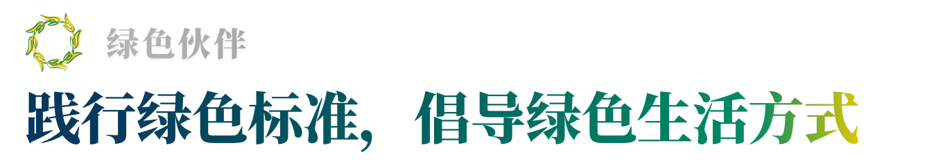 “绿色伙伴”是经济可持续、环境可持续和社会可持续兼容并序的均衡发展中坚持创新的企业。我们希望同众多企业一起,面向消费、市场和未来倡导绿色理念,践行绿色方法,实现可持续发展的企业目标和经济目标。